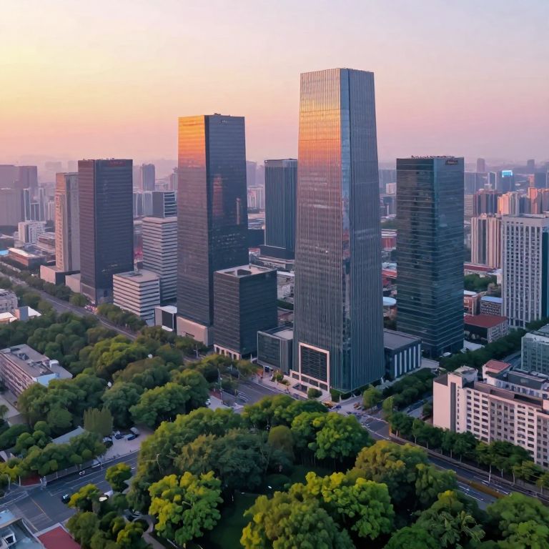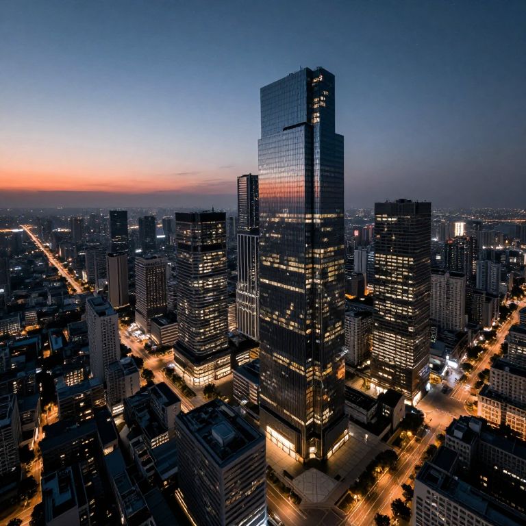 Aerial photograph of a cityscape at dusk, featuring illuminated skyscrapers with orange streetlights, a prominent reflective high-rise, and a purple-blue