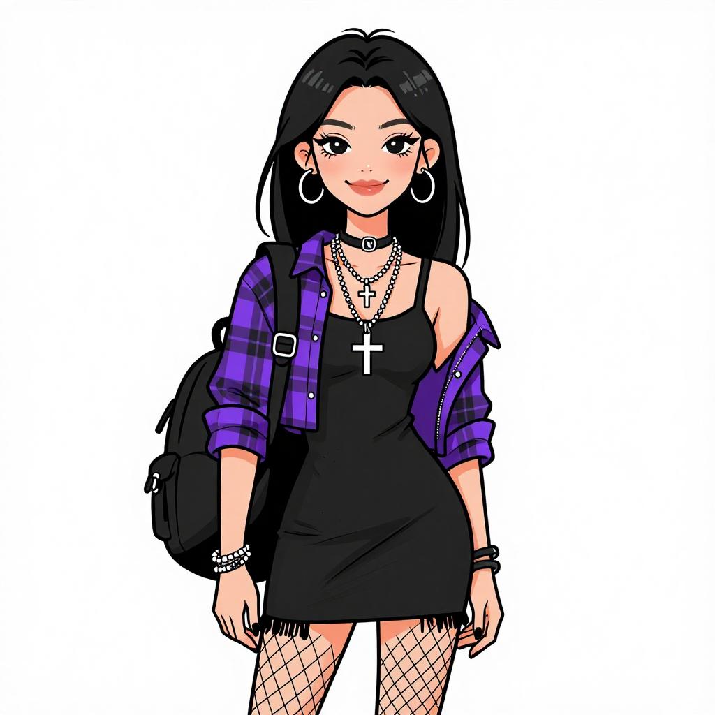 This digital drawing features a young woman with long black hair and fair skin, standing against a plain white background. She wears a black, sleeveless mini dress with thin straps, fishnet stockings, and a purple plaid shirt draped over her shoulders. Her accessories include large hoop earrings, multiple silver necklaces, a cross pendant, and bracelets. She carries a black backpack on her left shoulder. Her makeup is bold with dark eyeliner and red lipstick. The image uses bright, flat colors with bold outlines, giving it a modern, anime-inspired style.