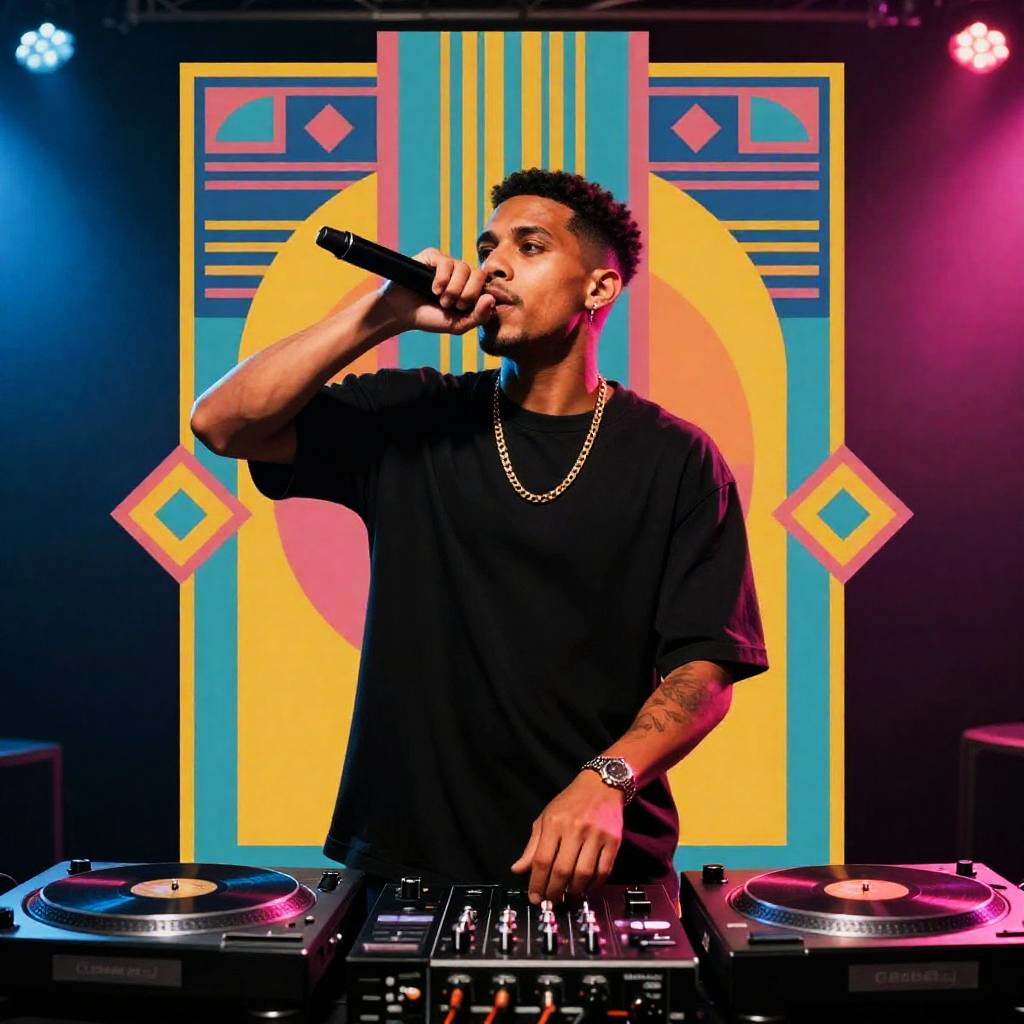 Realistic photo.Colorful Art Deco-inspired poster of a hip-hop artist rapping on stage, playing turntables, bold geometric patterns, vibrant lighting, and energetic vibe. realistic photo