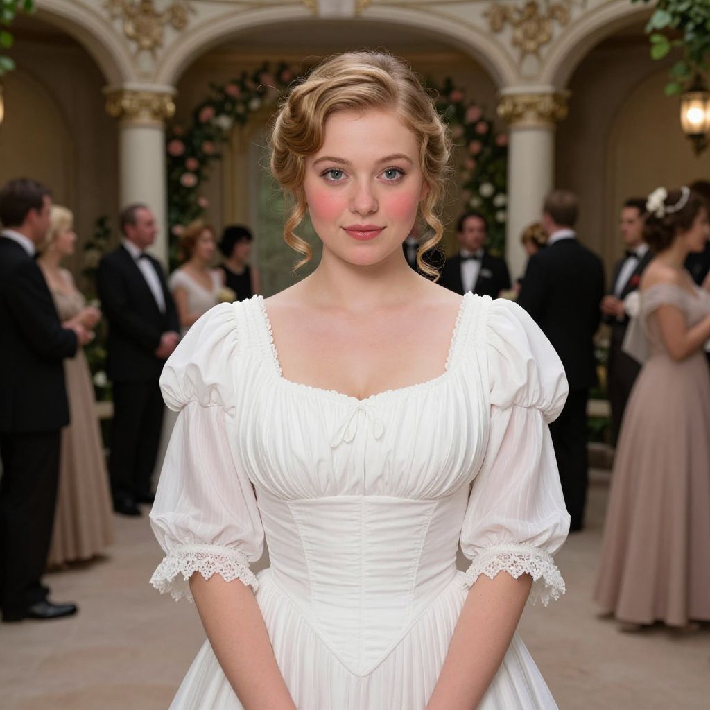 Photorealistic digital image of a young Caucasian woman with fair skin, blue eyes, and wavy, blonde hair styled in soft curls. She wears a white, Victorian-style wedding dress with puffed sleeves and lace trim, standing in the foreground. Her cheeks are slightly flushed. In the background, a grand, arched hall decorated with floral arrangements and lit by soft lighting. Guests, dressed in formal black tuxedos and pink dresses, mingle and chat. The image has a dreamy, romantic quality with a focus on the bride's elegant, traditional attire and the elegant, ornate setting.