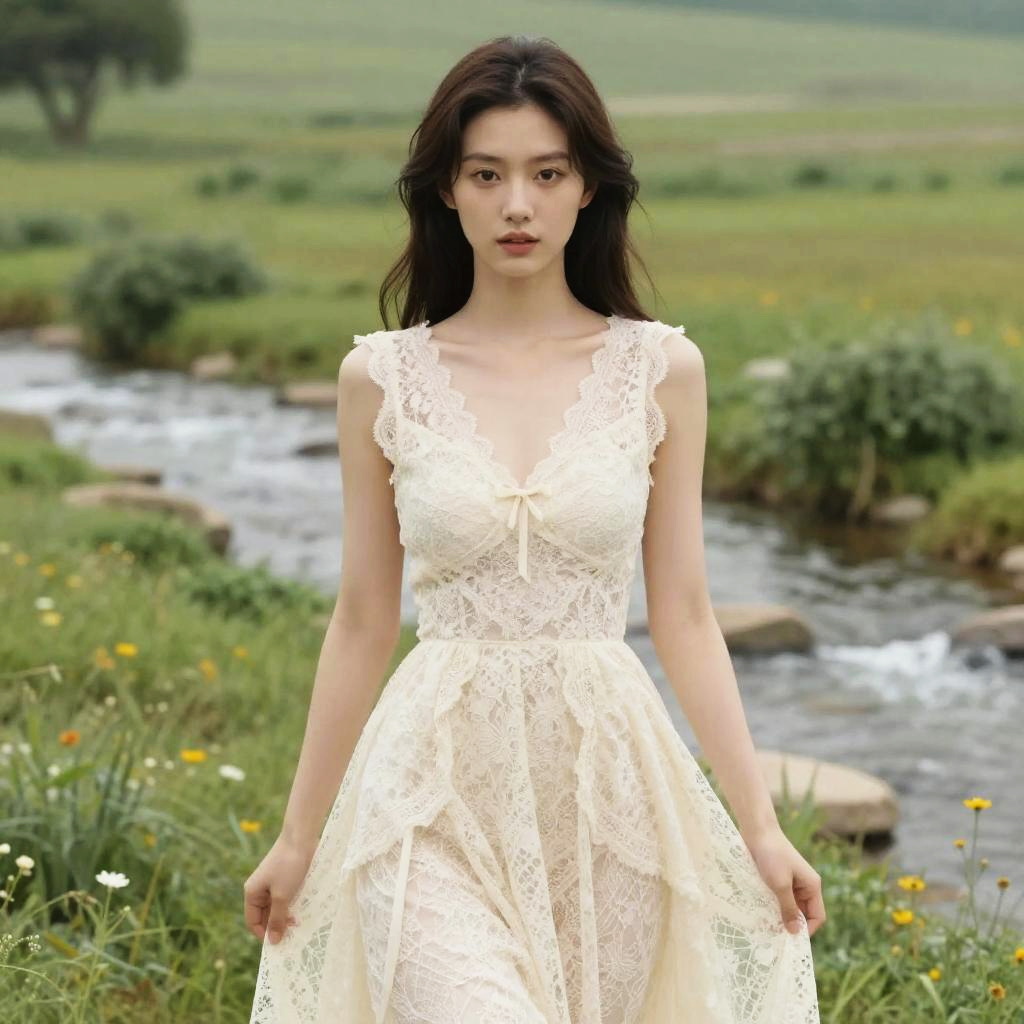 A Pear-shaped body type woman in a romantic whimsy style, wearing a blush pink layered chiffon mini dress with delicate spaghetti straps and a softly pleated skirt, stands gracefully by a flowing stream in a serene meadow. Her tousled waves and minimalist makeup complement the enchanting setting. Sexy. Pretty face and beutiful eyes