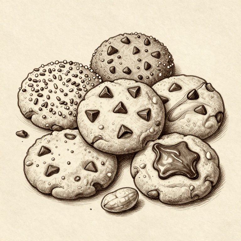A vintage-style cookie drawing showcasing a batch of assorted cookies including sugar, chocolate chip, and peanut butter, rendered in sepia tones with a textured paper background, intricate line work, and a warm nostalgic atmosphere, pencil and ink style.