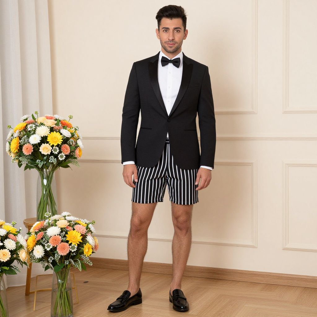 Photograph of a man in a black tuxedo jacket, white shirt, black bow tie, and black and white striped shorts, standing in front