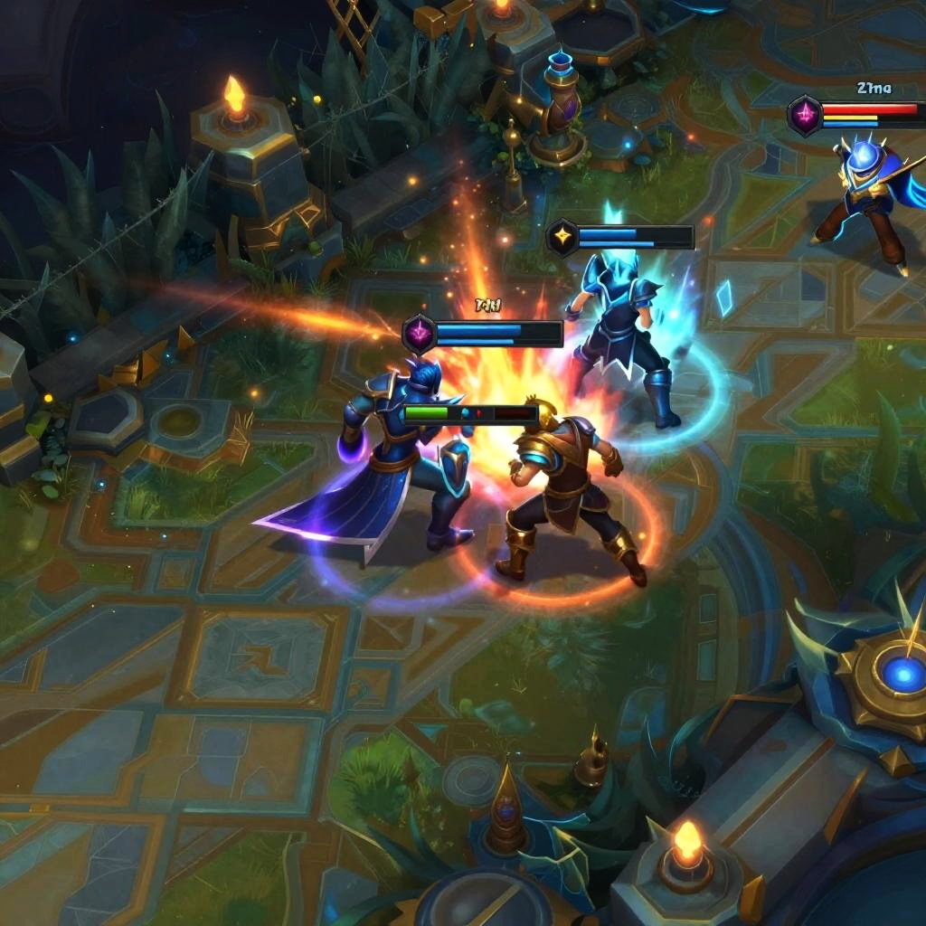 3d League of Legends image showcasing a dynamic battle scene with champions clashing on a mystical fantasy battlefield, vibrant spell effects, detailed armor designs, dramatic lighting, and a vivid, immersive environment blending magic and technology.
