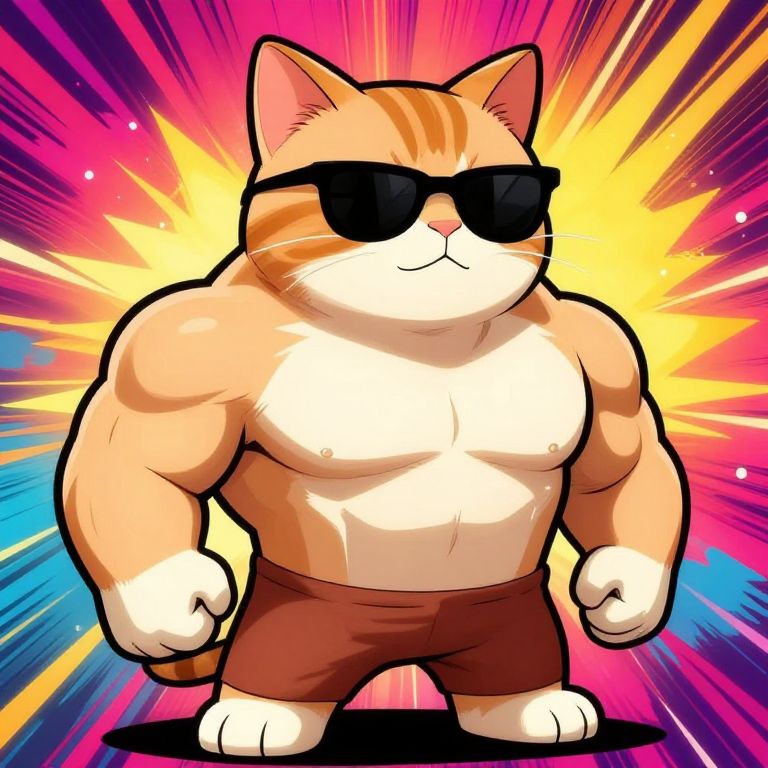 Gigachad cat meme, a muscular and confident anthropomorphic cat with chiseled features, standing proudly with sunglasses and a smirk, vibrant comic style background