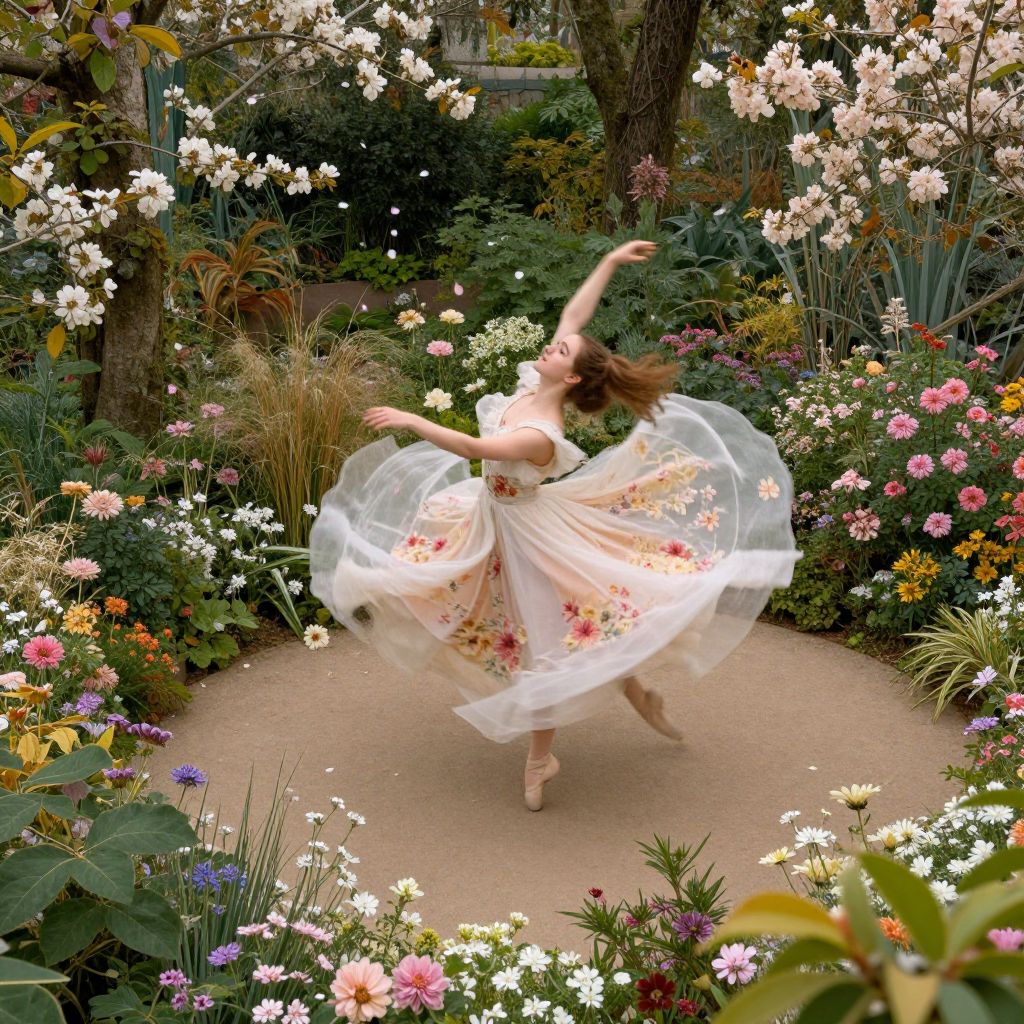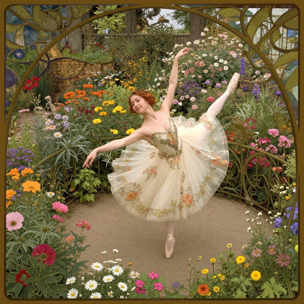 Imagine an enchanting garden in full bloom, crafted with the elegant lines and organic motifs reminiscent of Art Nouveau. From a high vantage point, witness an ethereal dancer pirouetting gracefully amidst the blossoming flora and verdant foliage. As she spins, her diaphanous skirt dances like flower petals caught on the wind, seamlessly blending into the surrounding botanical splendor. This captivating composition harmoniously intertwines the human form with nature's beauty, inviting contemplation of the fleeting yet timeless allure found in both art and the natural world.