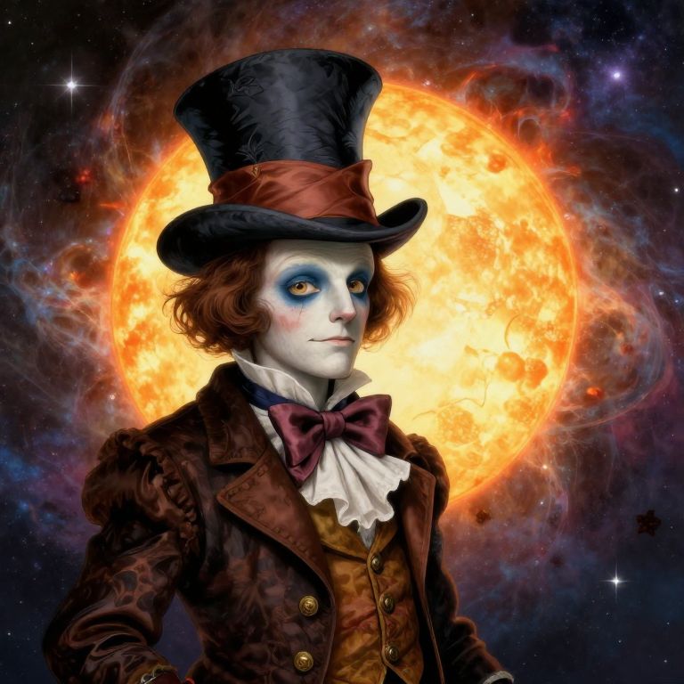 Digital artwork of a pale-skinned, white male with blue-painted eyes, wearing a black top hat, red ribbon, brown velvet jacket with gold buttons, and white ruffled shirt, adorned with a maroon bowtie. He has wavy brown hair and a stern expression. The background features a vibrant, glowing orange and yellow sun-like orb with cosmic, starry black space surrounding it, adding a surreal, magical atmosphere to the portrait. The style blends Victorian attire with fantastical elements.