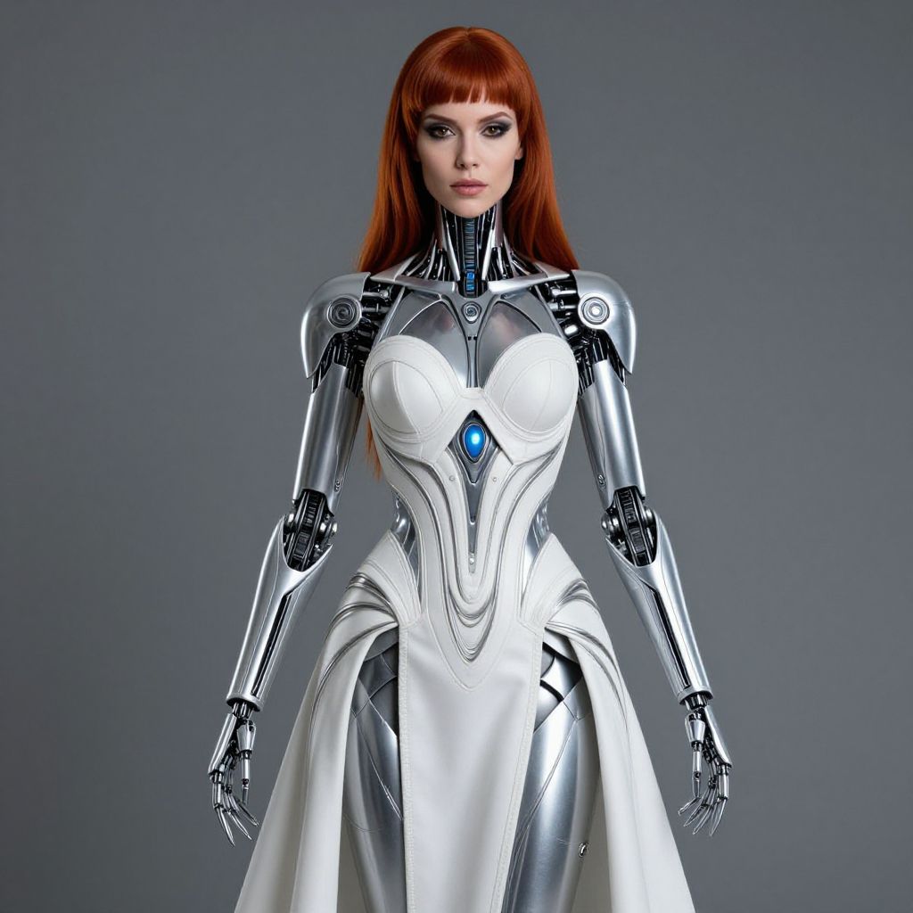 A highly detailed, futuristic, white and silver metallic dress with intricate designs, worn by a beautiful, red-haired woman with a cybernetic appearance, reminiscent of HR Giger's style.