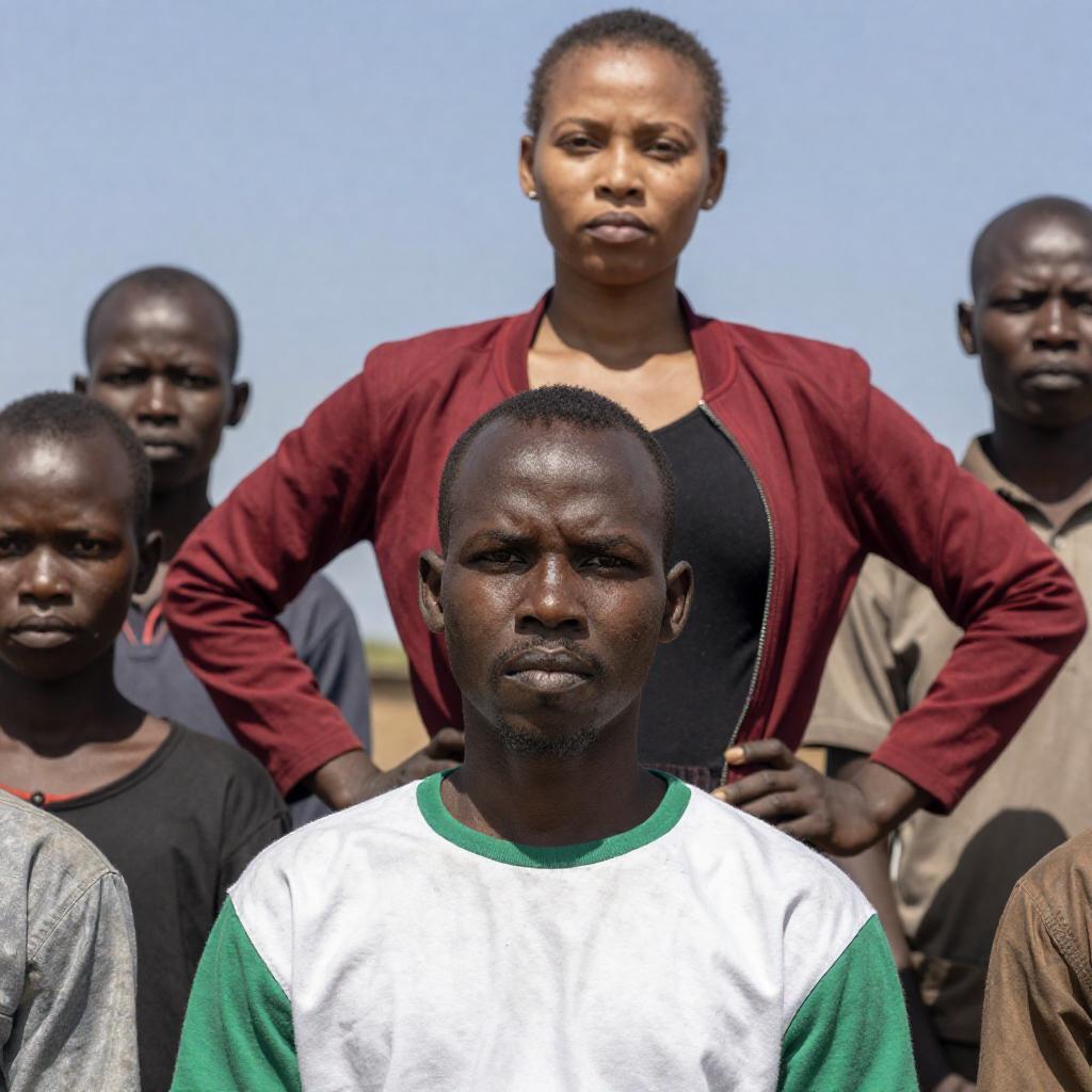 Photograph of four African men in a rocky, cave-like setting. One man in a green shirt and gray cap sits in the foreground, while three others, wearing striped shirts and caps, crouch behind large rocks. The background is misty and gray, with ured rock formations. The men have dark skin and are positioned closely together, appearing cautious and alert.