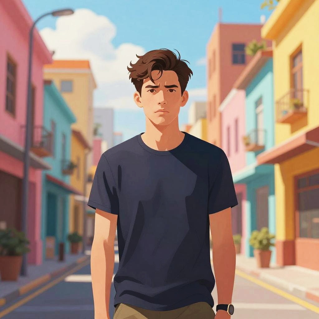 Digital art of a handsome young man with short brown hair, wearing a navy t-shirt, standing in a colorful, sunlit, narrow street.