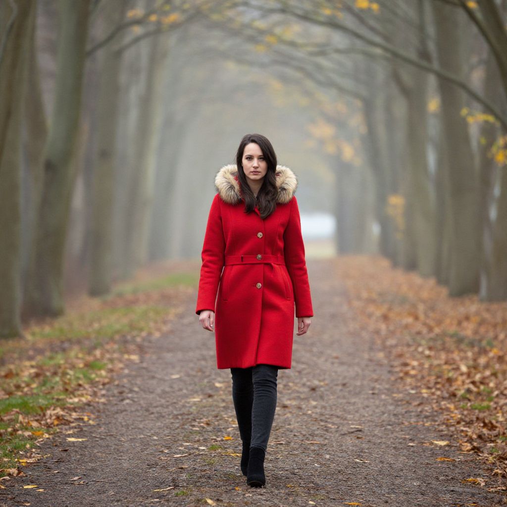 Young woman in a vibrant red overcoat with a luxurious fur-lined hood walks away along a misty forest path, surrounded by tall trees and scattered golden leaves.