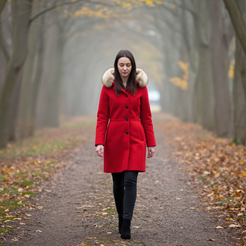 Photograph of a woman in a bright red coat with fur hood, black pants, and boots, walking down a foggy, autumnal path lined