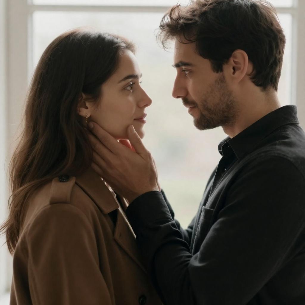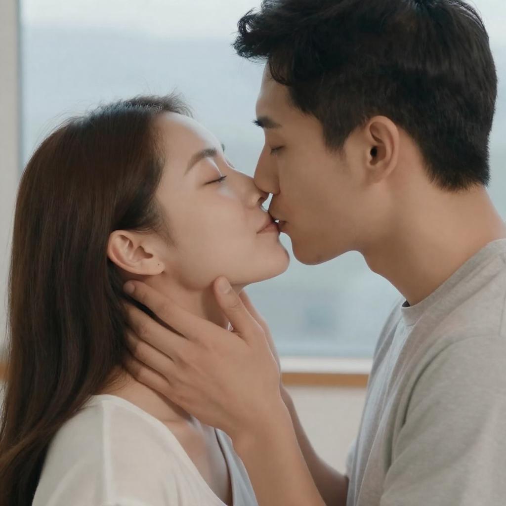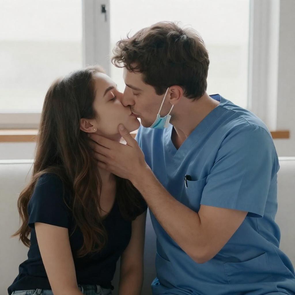 Photograph of a man and woman kissing. The man, wearing a blue medical scrub and a face mask, leans in to kiss the woman, who has long brown hair and wears a black top. They are seated on a white couch with a bright window in the background. The woman's eyes are closed, and the man's eyes are open.
