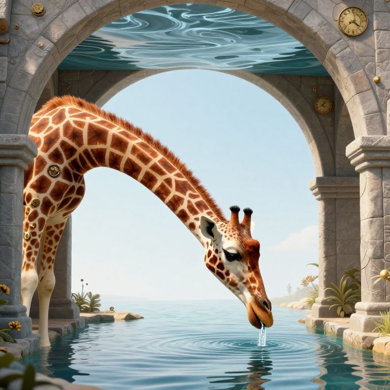 A digitally rendered image depicts a giraffe with a patterned coat of brown and white patches, bending its long neck to drink from a calm, blue water surface. The giraffe is positioned under a large, arching, stone structure with intricate carvings and two clock faces mounted on the sides. The sky is bright blue and visible through the arch. The water reflects the giraffe and the arch, creating a serene, surreal atmosphere. Small plants and flowers are near the base of the arch, adding a touch of greenery to the scene. The overall style is highly detailed and vibrant.