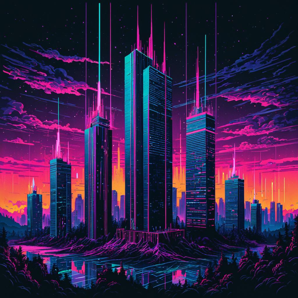Mystic Vaporwave, dreamlike neon skyscrapers, strong graphic lines, Behance award-winning, extraordinary, modern, screen print, pixelated glitch background, melting oil on canvas, dark colors, demonic in nature, parallel hyperdimension