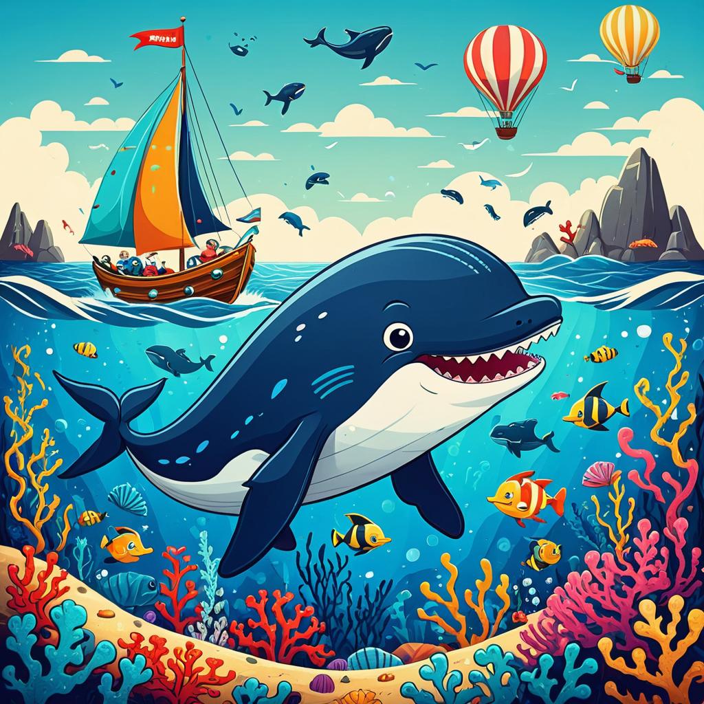 Stylized cartoon of a friendly whale with playful characters, colorful sails, bright seaweed, cheerful and adventurous theme.