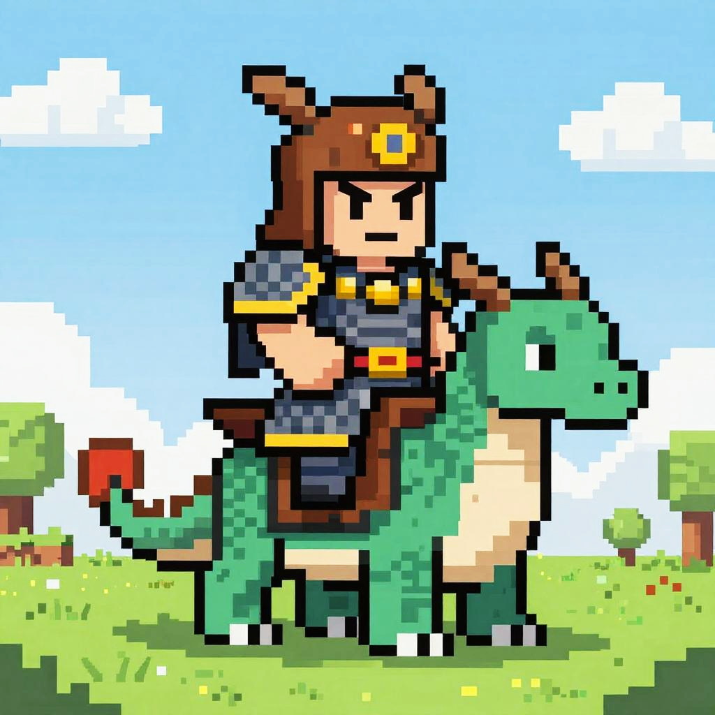 Pixel art warrior in ancient armor, gripping a glowing pixel sword, dynamic battle pose, surrounded by pixelated enemies, classic RPG game scene with rich pixel detail