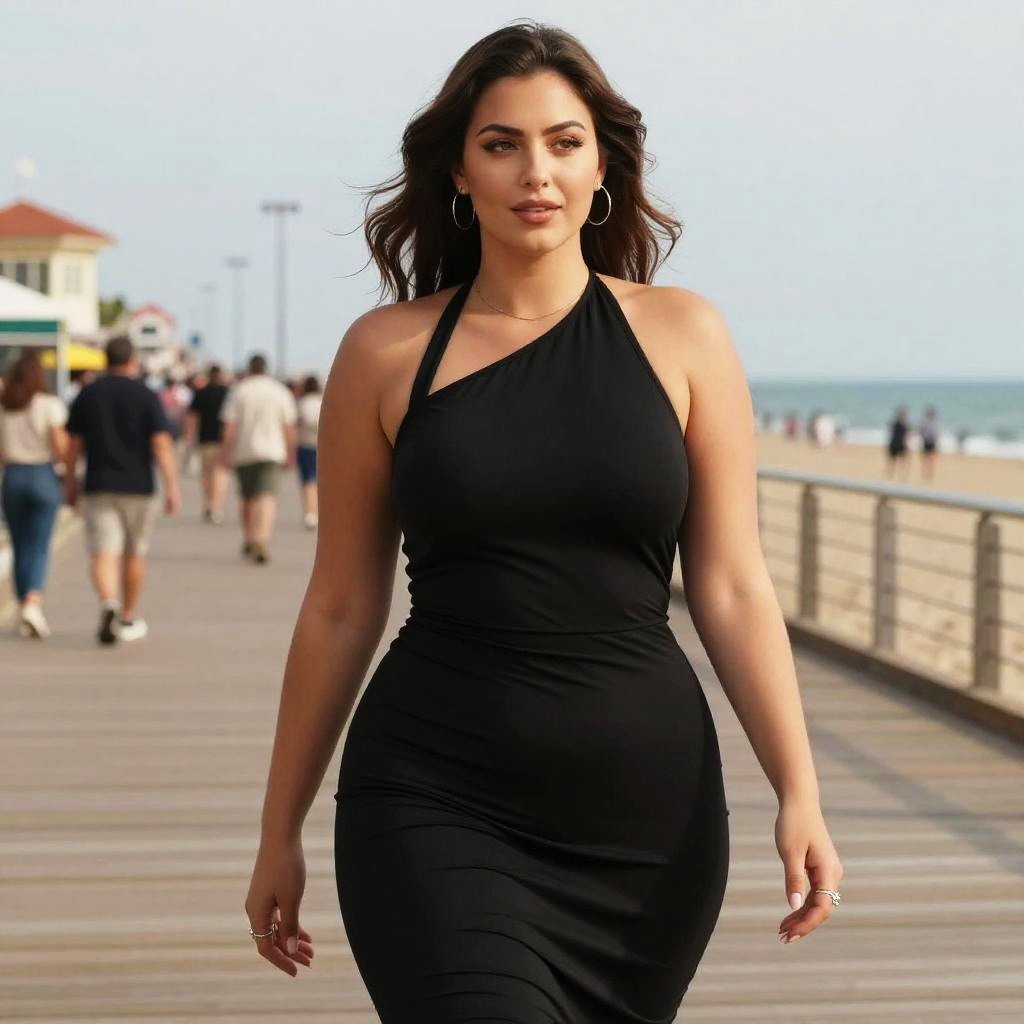 A curvy woman in a black halterneck bodycon dress with an asymmetric neckline and a fitted silhouette, accessorized with a silver bracelet and ring, stands confidently at a seaside boardwalk stroll, captured in a vibrant visual style. Sexy. Pretty face and beutiful eyes