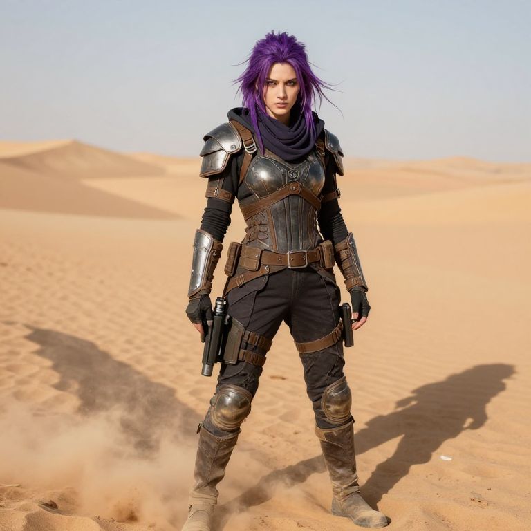 Purple hair outfit, post-apocalyptic warrior look, rugged tactical gear with layered armor, dust-filled desert landscape, fierce stance, detailed weapon accessories, contrasting soft purple hair style, intense sunlight casting long shadows, dramatic mood