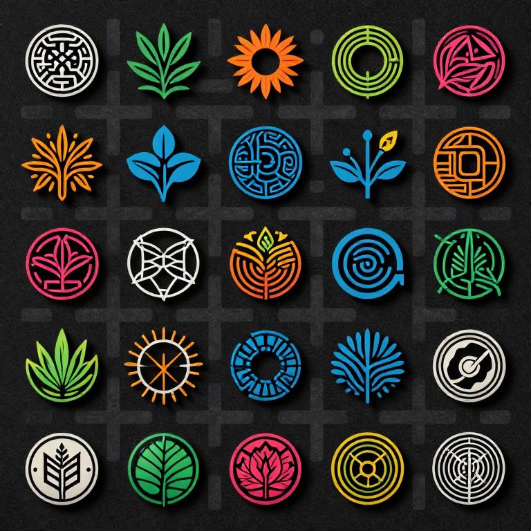 Vibrant digital illustration of 24 colorful, symmetrical, nature-inspired symbols in a grid, each featuring distinct shapes and patterns on a dark background