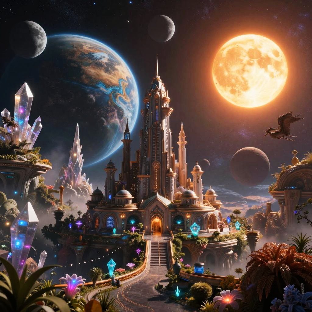 AI generated planets featuring futuristic alien cities and bioluminescent flora, with mysterious crystalline structures and exotic atmospheres, illuminated by multiple suns and moons, in a breathtaking cosmic panorama, digital art with vivid textures and depth.