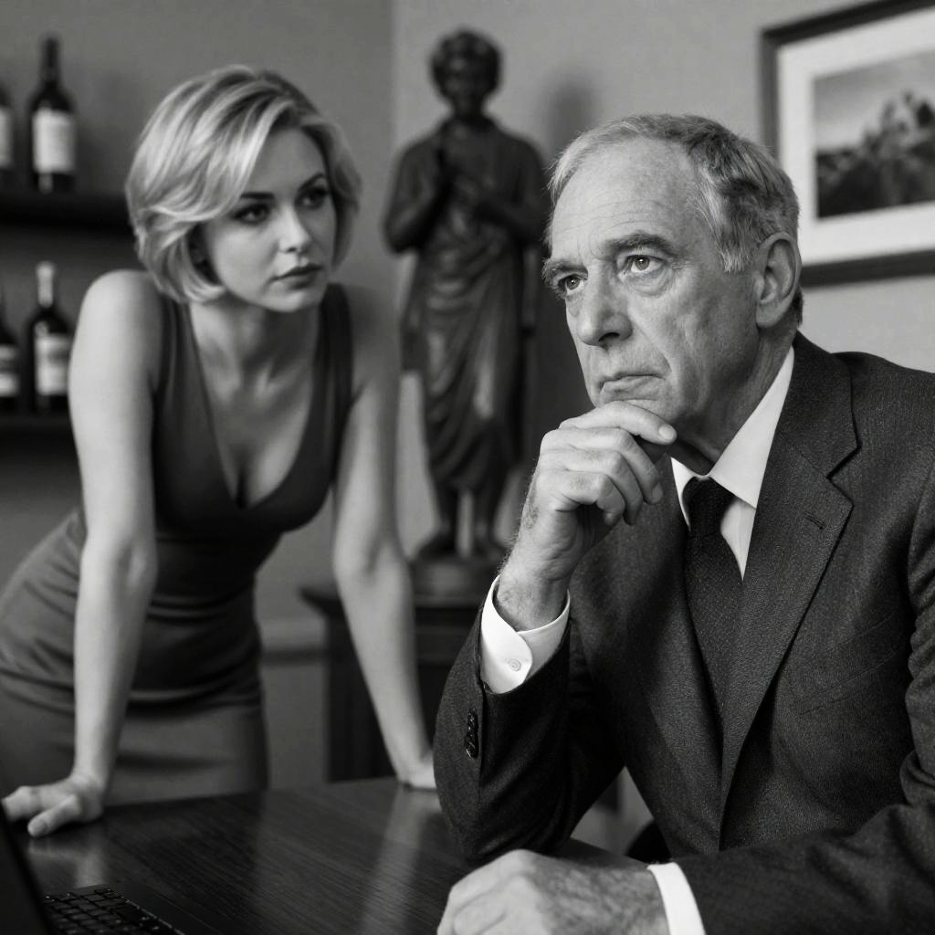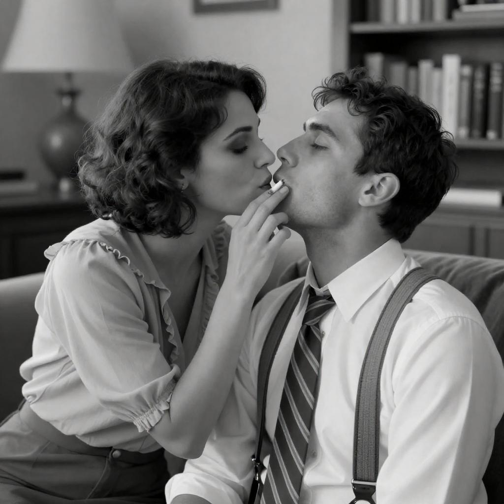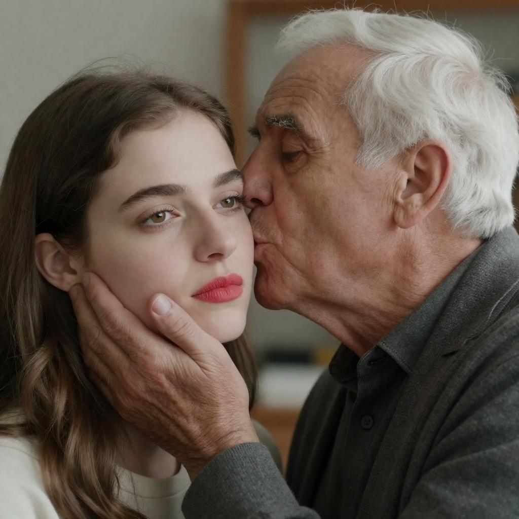 Black and white photograph of a formal event. Elderly man in tuxedo, eyes closed, being leaned over by young woman in polka dot dress, hand on his chest. Woman has braided hair, tongue out. Woman on left, white lace dress, hand on chin, looking away. Background: seated guests, table with candles, blurred figures. Young girl in striped dress, smiling, right foreground. Intense expressions on young woman's face.