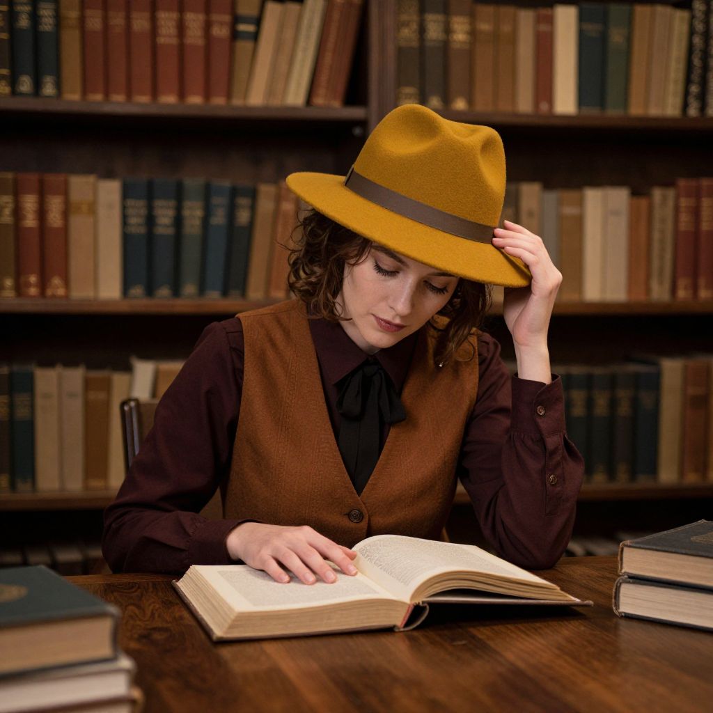 Enchanted library scene captures a woman in a mustard-yellow fedora and brown vest, thoughtfully perched at a wooden table, her hand gently resting on an open book while the other touches her hat, surrounded by shelves brimming with countless books.