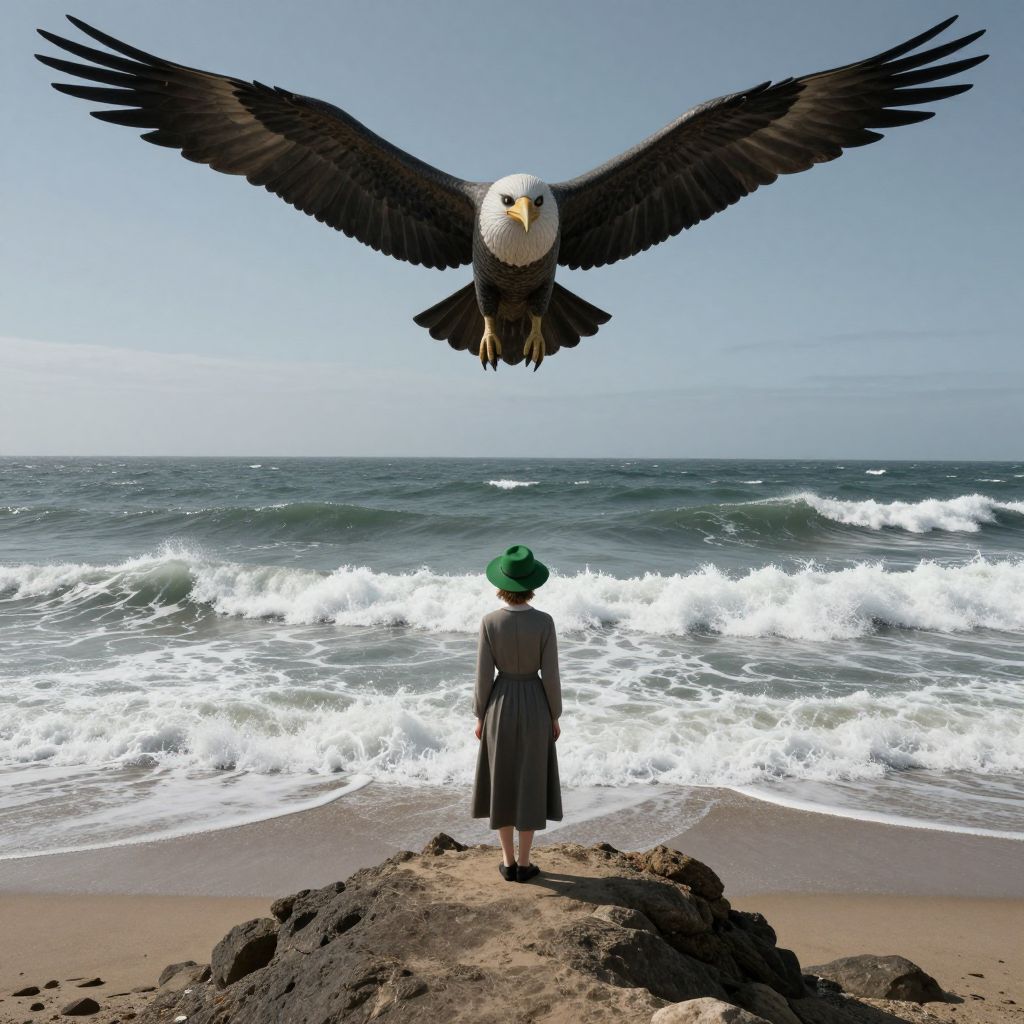 Craft an image in the surreal vein of Magritte-esque dreamscapes, portraying a woman with a green hat standing resolutely on a desolate shoreline where tumultuous waves crash against the sandy expanse. She gazes towards the sky, her back turned to the churning sea, as a colossal avian creature soars majestically above the horizon, its immense wingspan seemingly stretching into infinity. The perspective is from below this extraordinary bird's massive feet, offering an aerial view that challenges our perception of reality and stirs feelings of wonder and intrigue in viewers, inviting them to ponder the enigmatic world unfolding before their eyes.