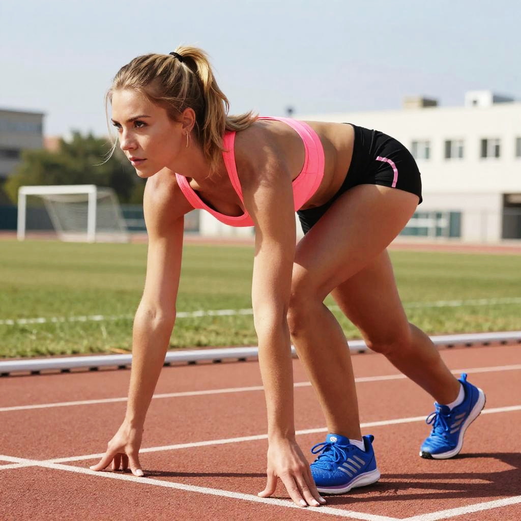 Photograph of a fit young woman with light brown hair in a ponytail, wearing a black sports bra and pink and white patterned shorts, bending forward to tie her white sneakers. She's standing on a wooden walkway with a brick building in the blurred background. The sunlight casts clear shadows, highlighting her toned muscles and casual, outdoor workout vibe.