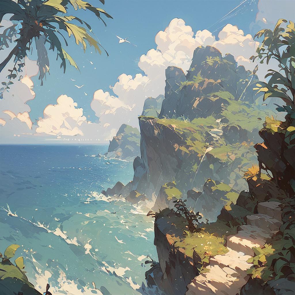 Score_9, score_8_up, score_7_up, score_6_up, source anime, no humans, scenery, landscape, ocean, sea, palm tree