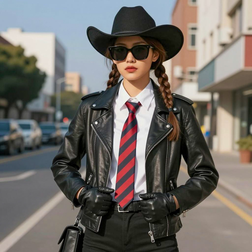 Photo of a woman with long black hair tied in a ponytail, wearing a black leather jacket and black pants, standing with her back to the camera. She is positioned on gray pavement with square tiles in front of a modern building with large glass windows. In the background, there are wooden chairs and tables along with a black car parked nearby.