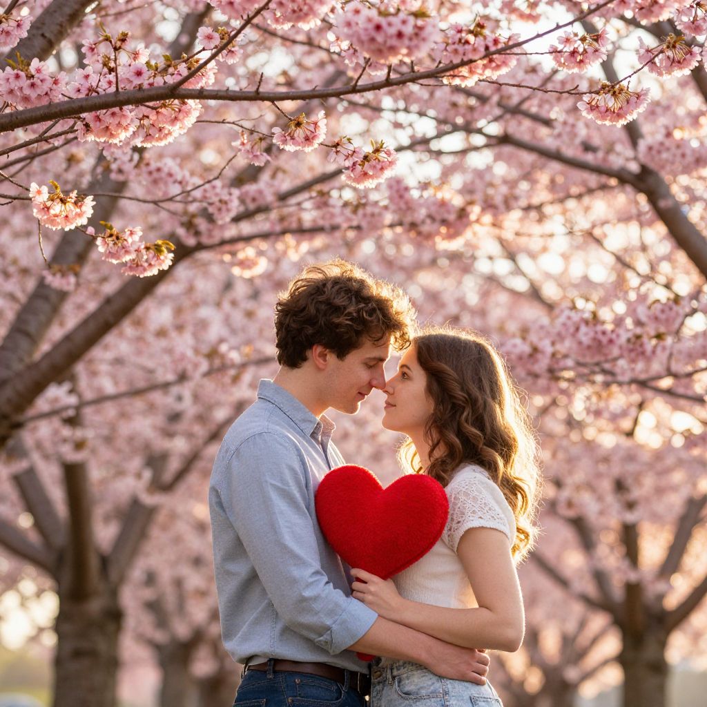 Romantic couple embracing tenderly under a canopy of vibrant cherry blossoms, illuminated by a warm sunset glow, as the woman holds a plush red heart-shaped bouquet.