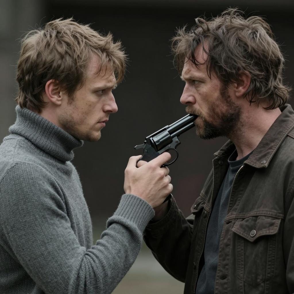 Three men in a narrow, dimly lit room. One man in a white shirt holds a second man in a brown jacket against a wall, with intense expressions. A third man in a brown leather jacket forcefully pins the second man's arm. Beige patterned wallpaper, green curtains, and a cluttered shelf in the background. Ceiling tiles and fluorescent lights overhead. Second man's face pressed against wall, eyes closed. Upper bodies close together, intense physical confrontation.