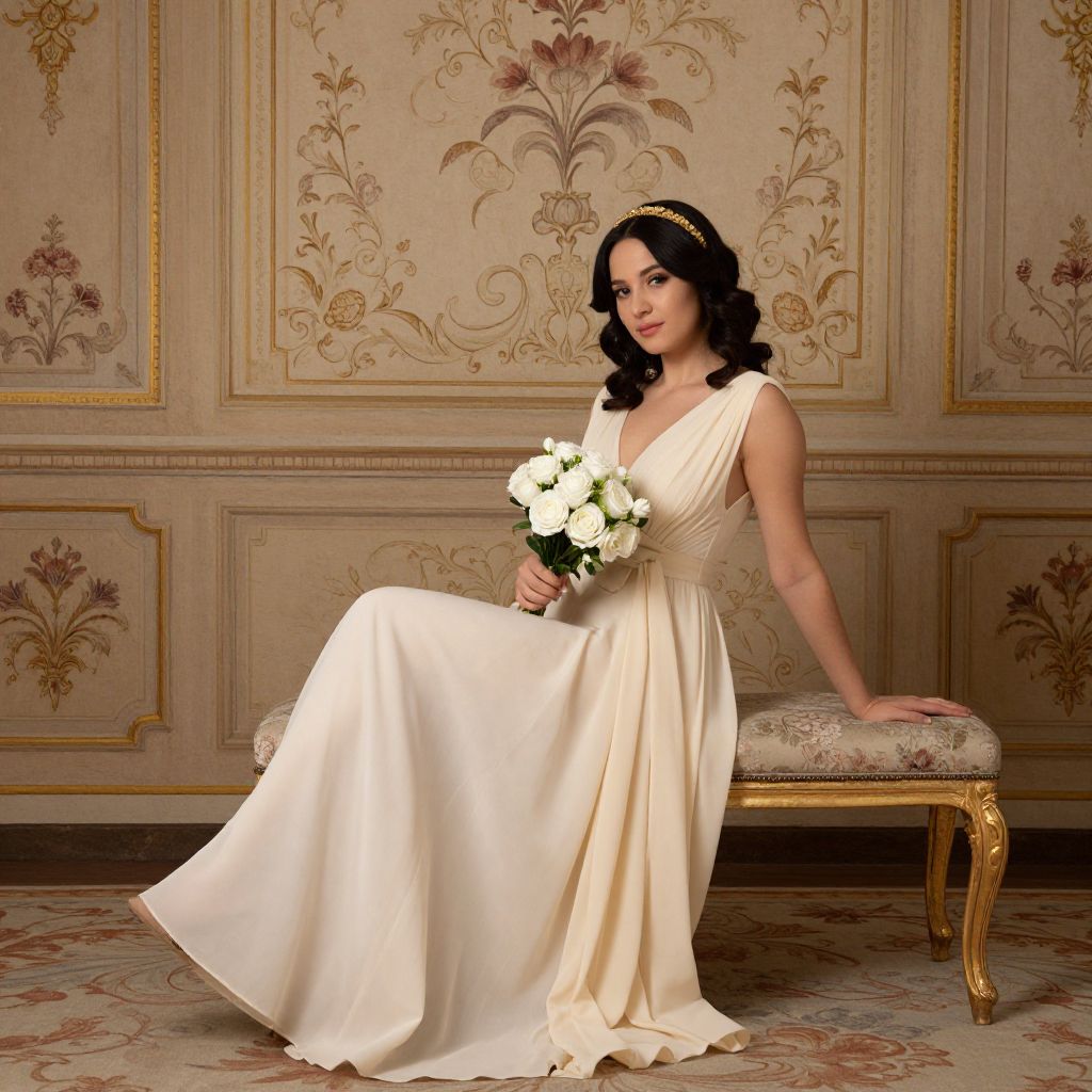 Photograph of a fair-skinned woman with dark, wavy hair wearing a sleeveless, ivory satin wedding gown with a V-neckline. She has a gold headband and holds a bouquet of white flowers. She is seated on an ornate, cream-colored bench with wooden legs and a patterned cushion. The background features elaborately decorated, beige walls with floral and geometric patterns, adding an elegant, vintage feel. The woman gazes softly at the camera with a gentle smile, exuding a classic, timeless bridal elegance.