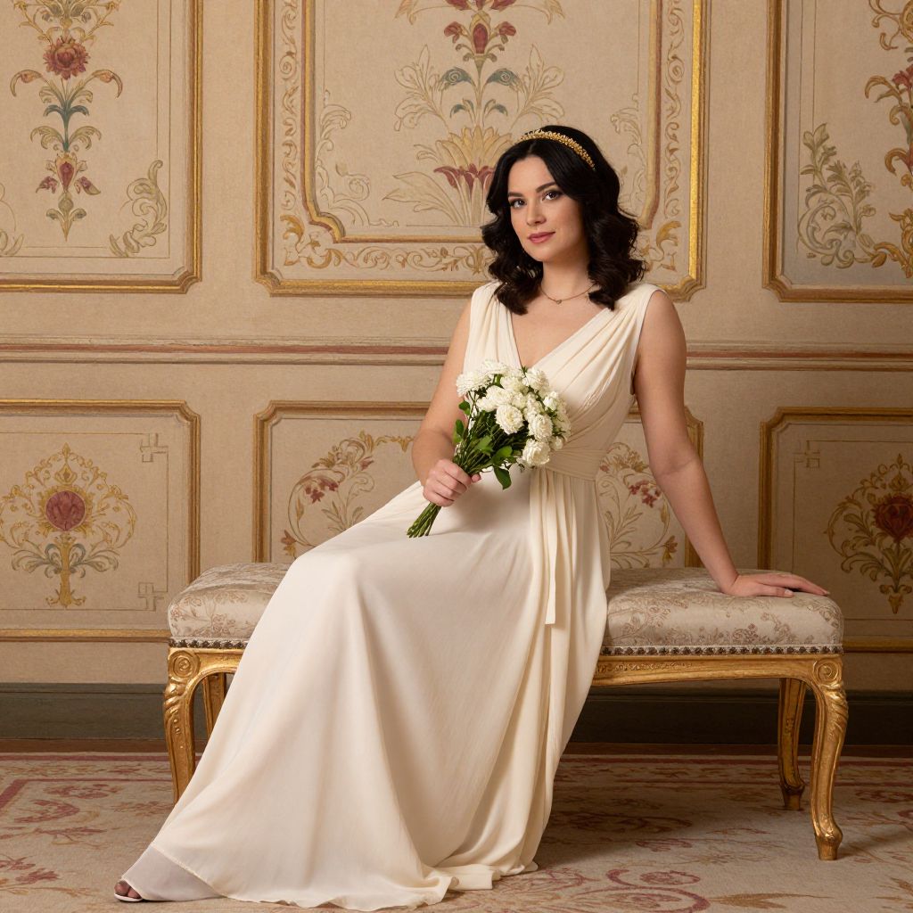 Seated gracefully in an ornate room adorned with intricate floral patterns and gold accents, a woman in a flowing cream gown holds a delicate bouquet of white flowers, her dark curls framed by a golden headband as she rests her hand on a cushioned bench.
