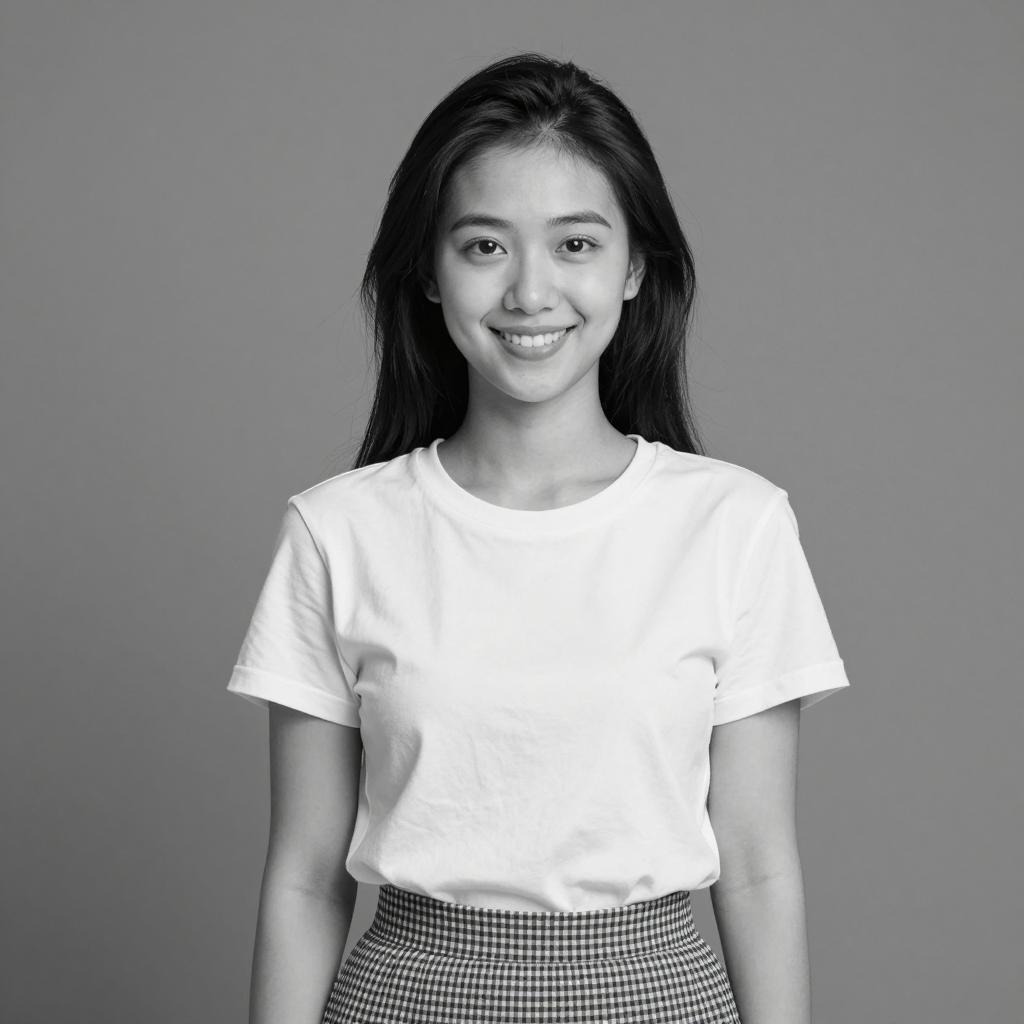 Monochrome portrait of a young Asian woman with long dark hair, wearing a plain white short-sleeve t-shirt and a checkered skirt, smiling directly at the camera against a plain grey background.
