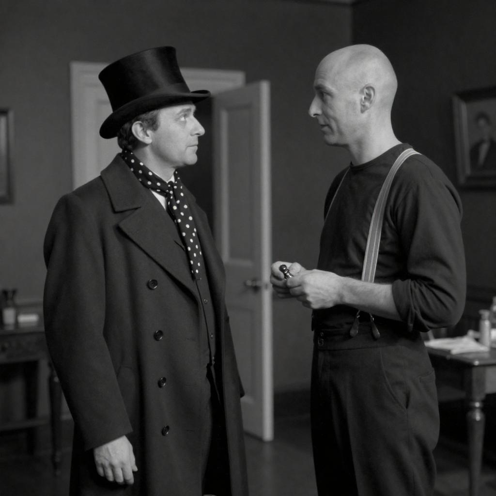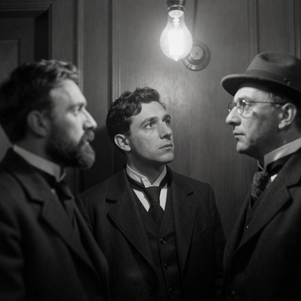 Black-and-white photograph of four people in Victorian-style top hats and formal attire. Three men and one woman with curly hair sit closely, holding canes. Men on left and right look at each other, middle-aged man in center looks forward. Woman in center looks to the right. Dark background.