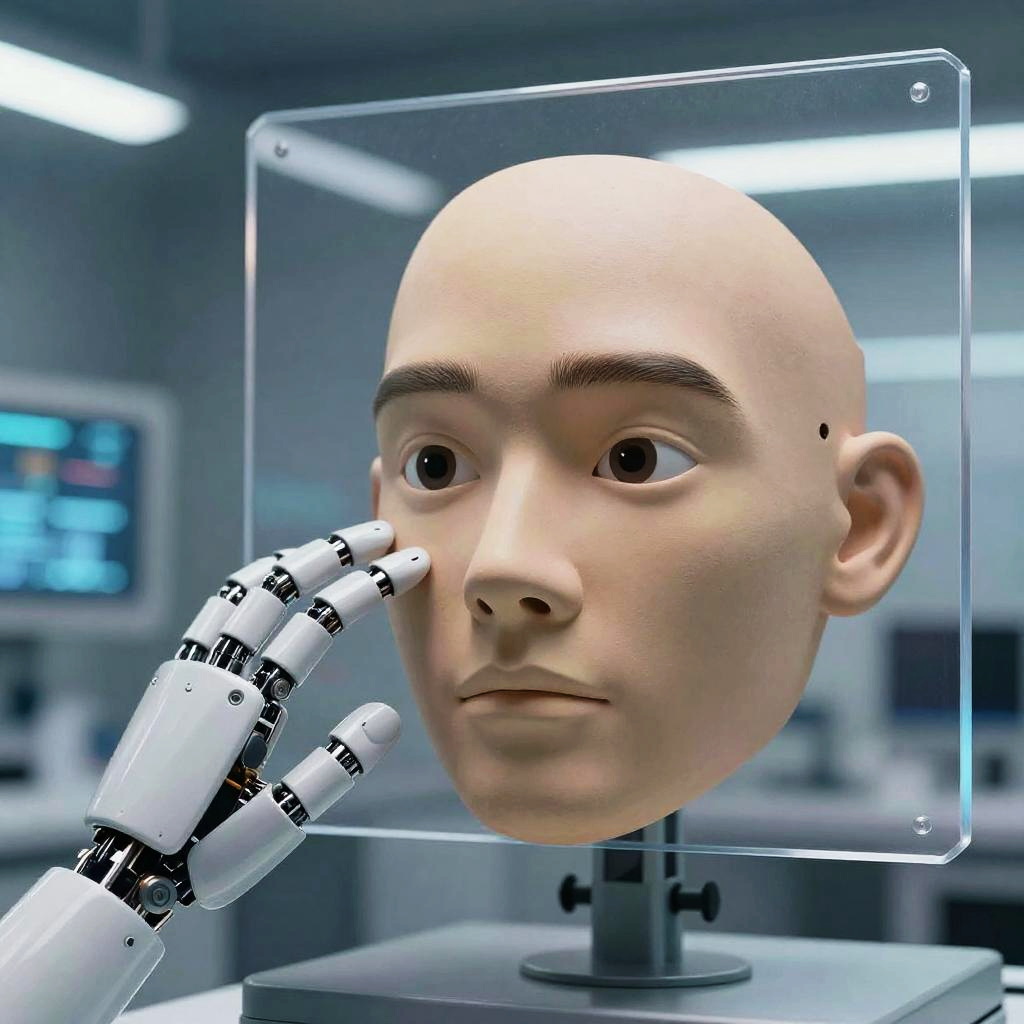 Conceptual digital art of change facial expression AI, depicting a robotic hand adjusting a realistic human mask with various emotions, futuristic lab background with transparent screens, cool tones, detailed textures, cinematic lighting