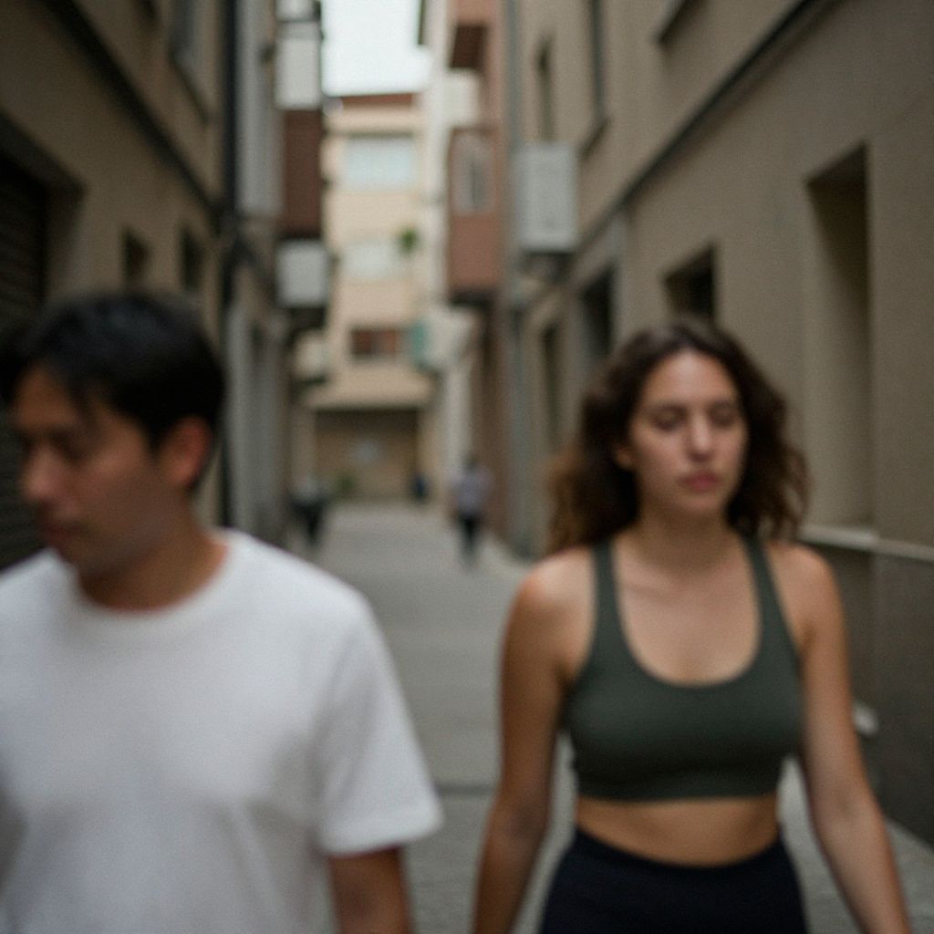 This blurry photograph shows a narrow, dimly-lit urban alleyway with beige and brown buildings on either side. On the left, a person with short dark hair and a white shirt is partially visible, while on the right, a woman with wavy brown hair and a dark green sports bra walks by. The image has a grainy, pixelated quality.