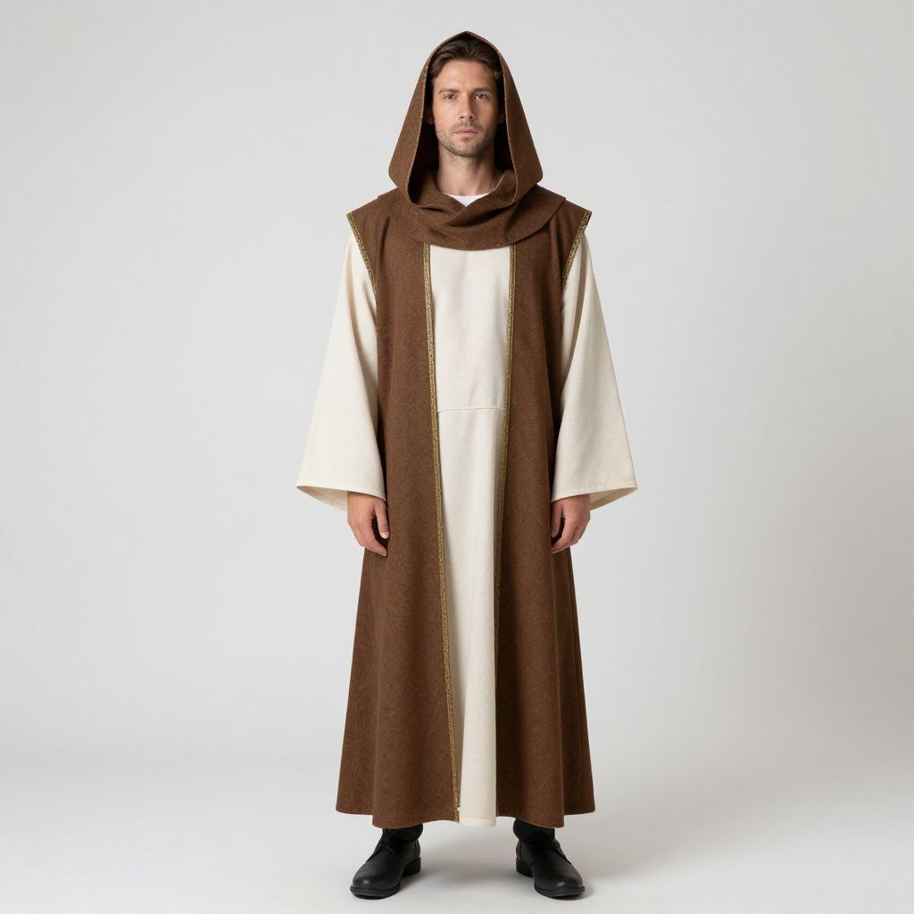 Photograph of a man standing against a plain white background. He has fair skin, brown hair, and a short beard. He wears a brown hooded robe with a white tunic underneath, the robe has a central seam and long sleeves. The robe is floor-length and brown, contrasting with the white tunic. He has black shoes on. His expression is neutral, and he stands with arms relaxed at his sides. The lighting is even, highlighting the colors and textures of the clothing.