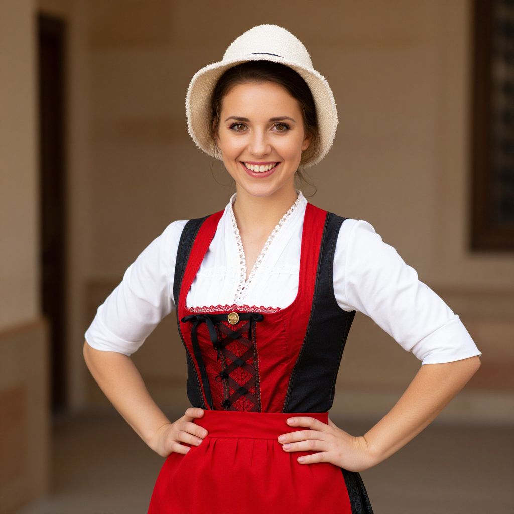 "Woman German Costume, woman in traditional dress with hat and red apron posing for a picture"