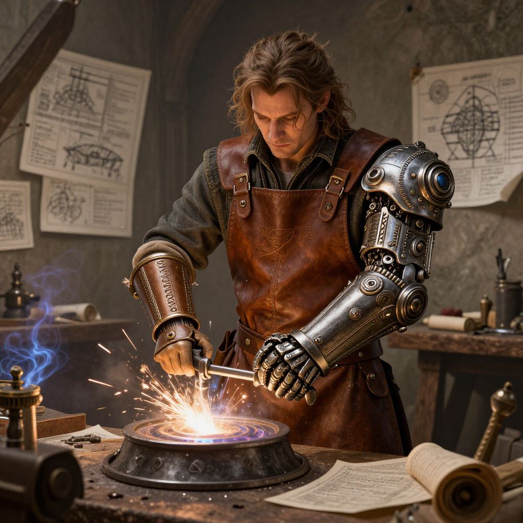 Halfling artificer working on a magical crossbow prototype in a cluttered workshop, sparks flying from welding tools, surrounded by steampunk machinery and arcane symbols glowing faintly, moody and atmospheric lighting, rich textures and fantasy realism.