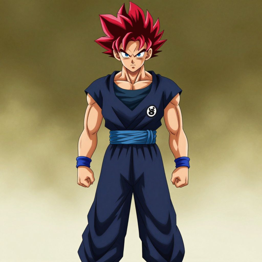 Digital anime-style drawing of a muscular, red-haired Super Saiyan with spiky hair, wearing a black gi, blue sash, and wristbands