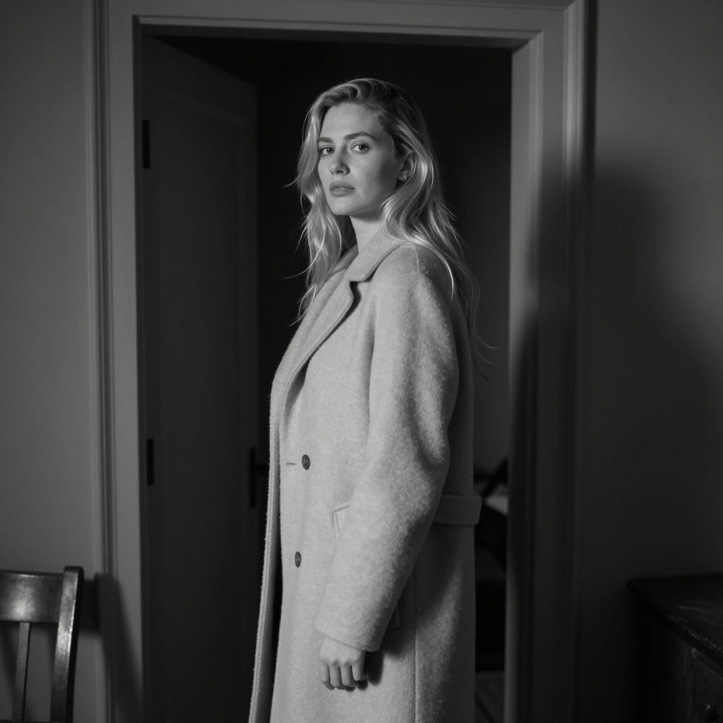 Woman with short blonde hair in a sleeveless, white, sheer dress stands in a dimly lit, narrow hallway. Warm light from the door behind her illuminates her. Textured walls on both sides. Hand in foreground, slightly blurred. Two small decorative items on right wall.