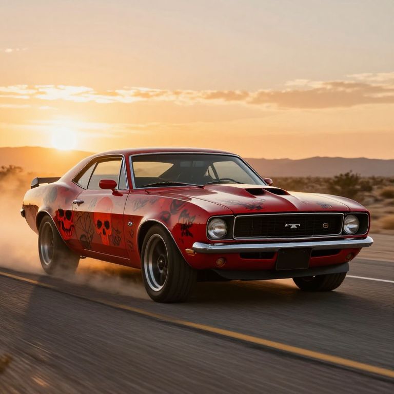 A vintage muscle car decorated with striking red skulls, cruising down a desert highway under a blazing sunset, dust clouds rising behind, bold and aggressive design, sharp metallic textures, warm golden tones highlighting the skull motifs.