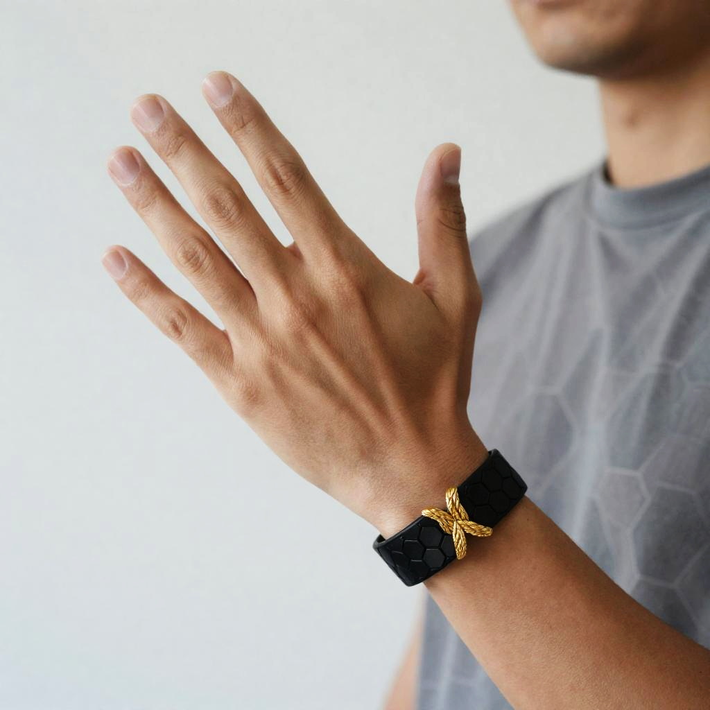 Photograph of a person's hand wearing a black hexagon-patterned wristband with a gold braid-like ornament. Background shows a blurred, light-colored wall and part of the person's grey, hexagon-patterned shirt. Hand is raised slightly, fingers splayed.