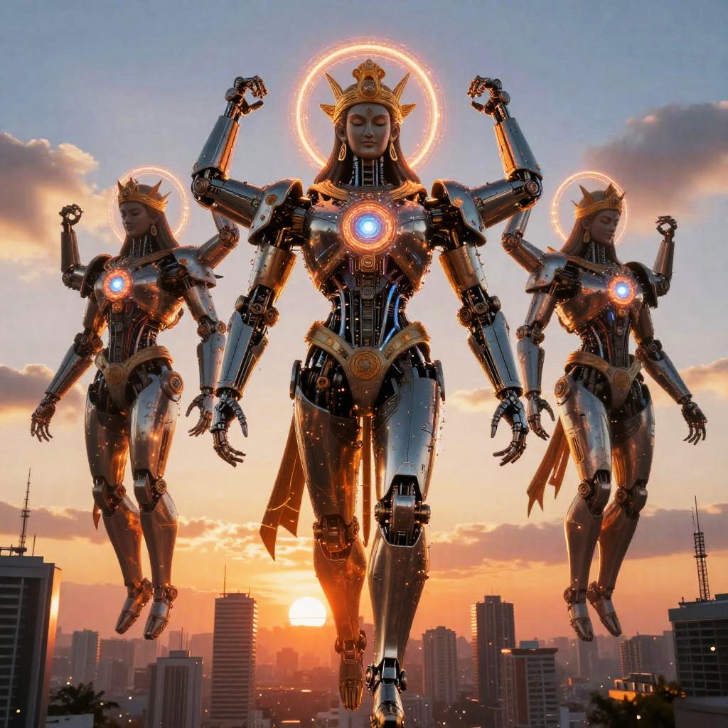 Photograph of three robotic deities with metallic, silver bodies and golden accents, standing against a sunset sky. They have six arms each, with glowing blue eyes and halos of light encircling their heads. Their design combines cybernetic and divine elements, with intricate armor-like details. The central deity has a regal crown, while the flanking deities have simpler headgear. They stand on a cityscape with tall buildings silhouetted against the orange and purple sky. The robots' poses are powerful and symmetrical, exuding an aura of majesty and advanced technology.