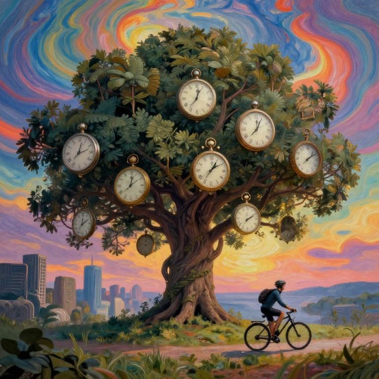 Craft an image embodying surreal landscapes adorned with timepieces that seem to lose their rigid form, hanging from the limbs of a colossal tree. The heavens above should burst with swirling hues reminiscent of impressionist masterpieces, seamlessly transitioning into a distorted skyline where earth and sky merge mysteriously. A solitary cyclist, depicted with hyperrealistic detail and a sense of swift movement, navigates through this enigmatic tableau, inviting curiosity as viewers are enveloped in a dreamlike world brimming with wonder and intrigue.