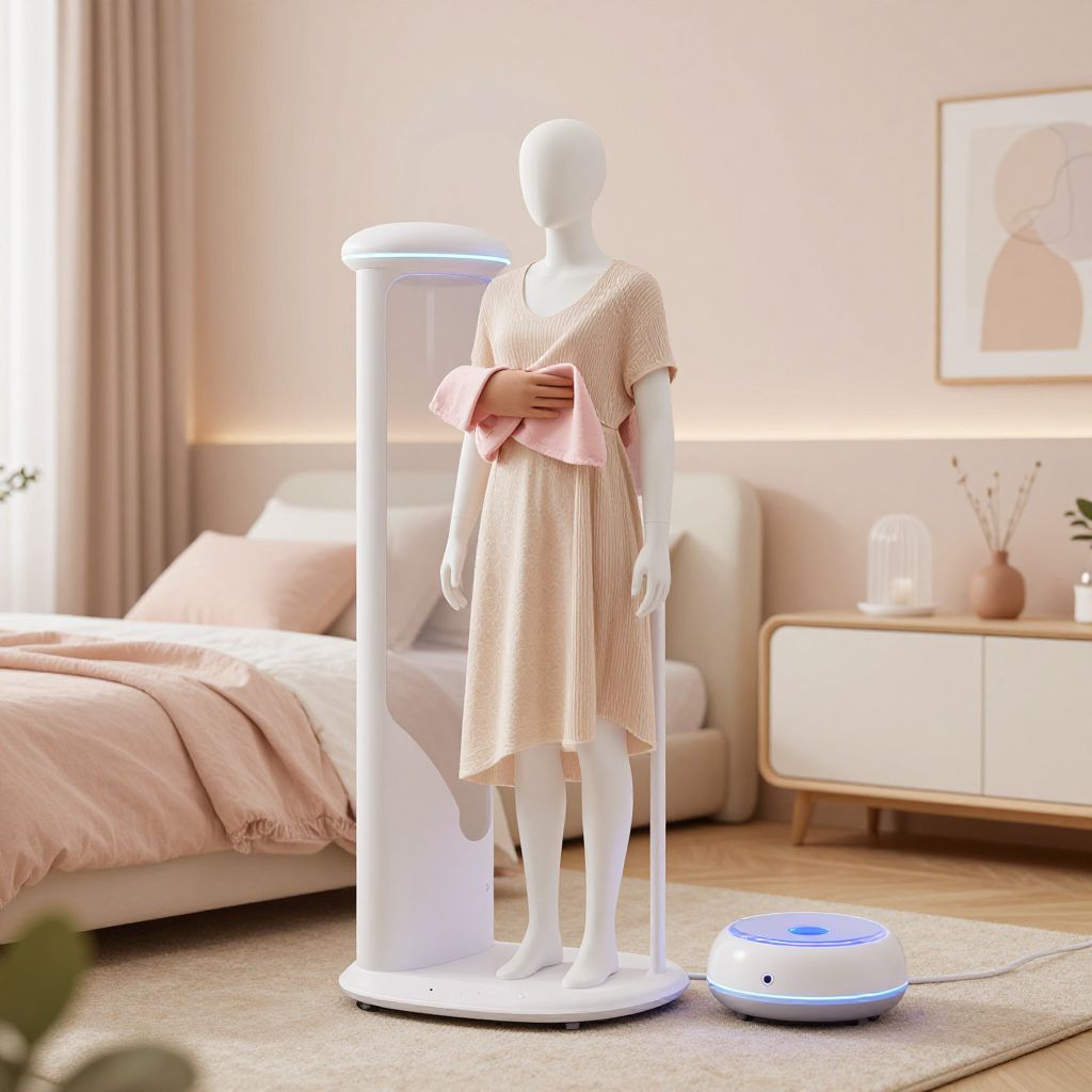 AI cloth remover gadget in a stylish modern bedroom, futuristic AI assistant gently undressing virtual clothes from a human avatar, soft pastel colors, cozy and comfortable atmosphere, photorealistic rendering