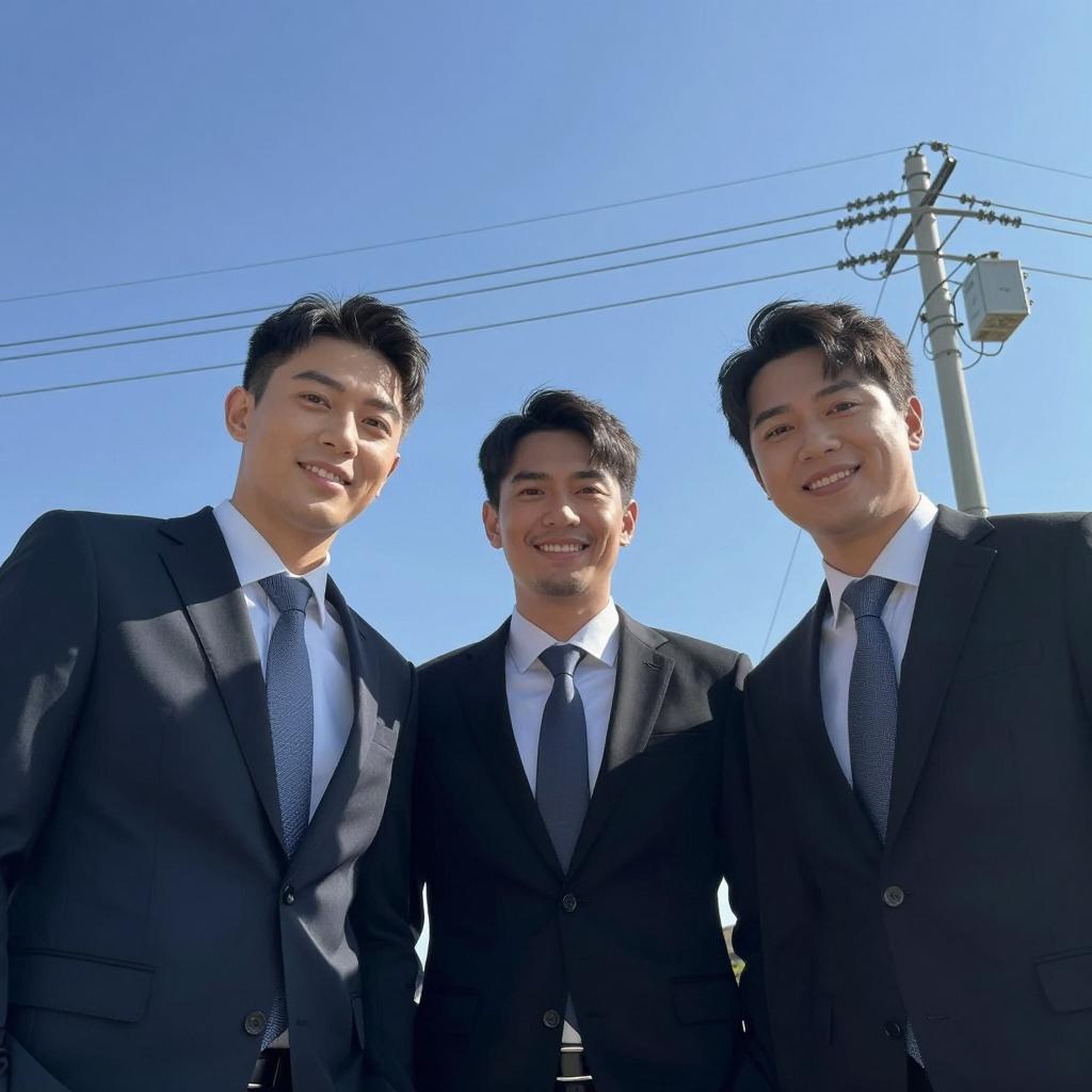 Four men in a spa. Central man with glasses, short hair, white towel around neck, hand near chin. Two men in towels to left and right, one shirtless in background. All men have neutral or slightly serious expressions. Background is plain.